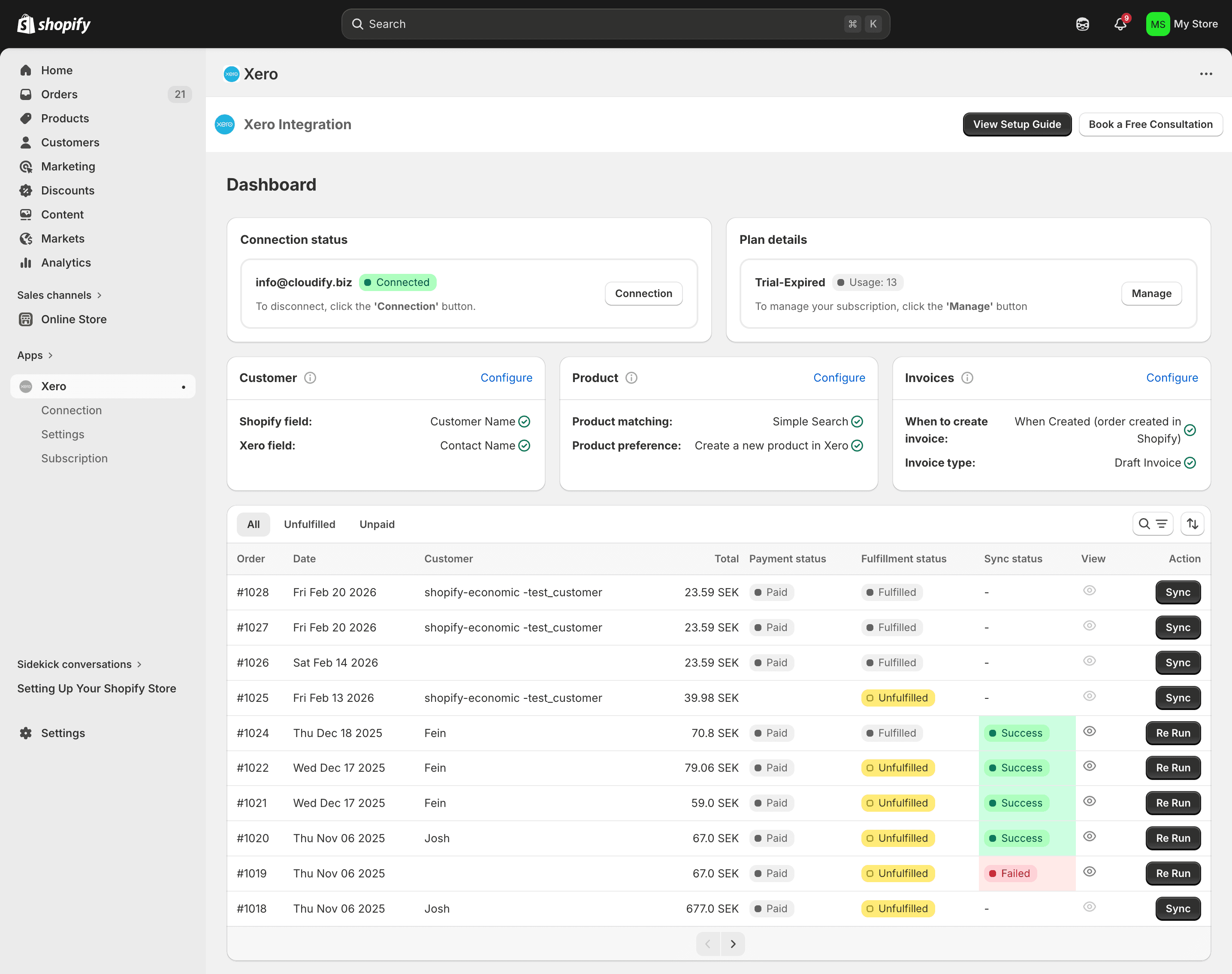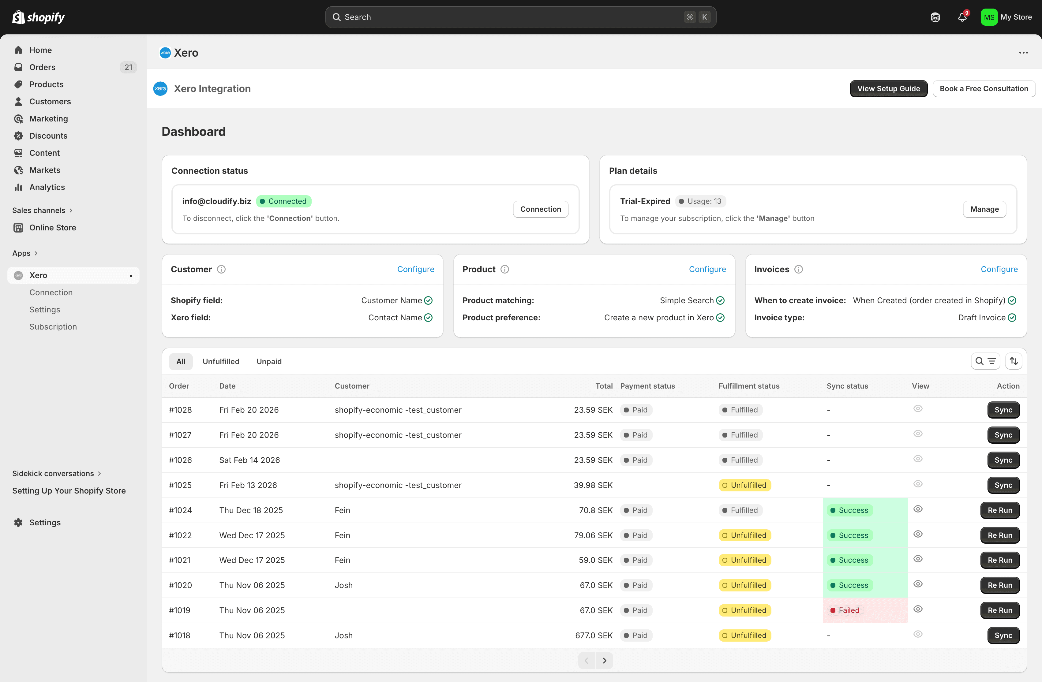 Your Cloudify dashboard shows every order and its live sync status. See what succeeded, what failed, and take immediate action without ever leaving Shopify.