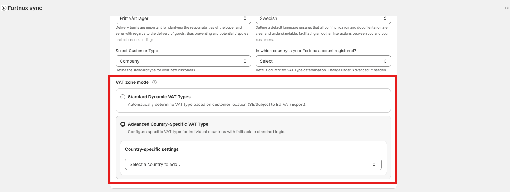 Define how customer data is synchronized between Shopify and Fortnox. Choose a unique field, like email or VAT number, to prevent duplicates. A new customer is created only when the customer is not found in Fortnox by the defined search parameter.